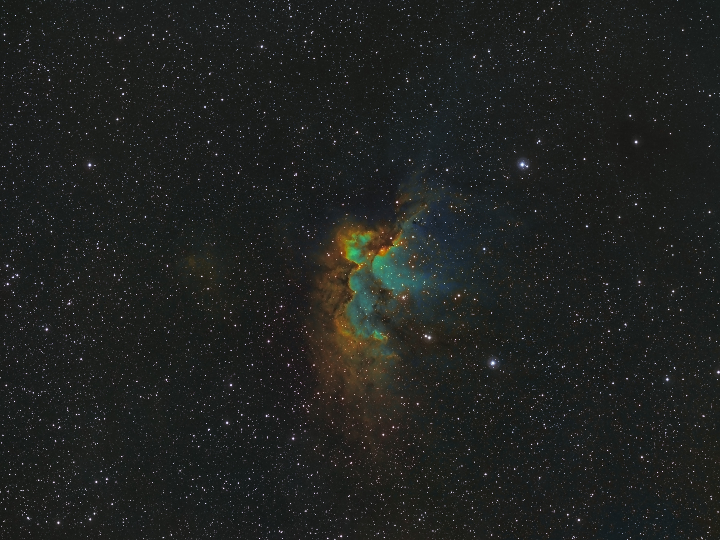 This is my image of the open star cluster NGC 7380, also known as the Wizard Nebula. It is located in the constellation Cepheus about 7,000 light-years from Earth within the Milky Way Galaxy. The star cluster is embedded in a nebula, which spans some 110 light-years. The stars of NGC 7380 have emerged from this star-forming region in the last 5 million years or so, making it a relatively young cluster.