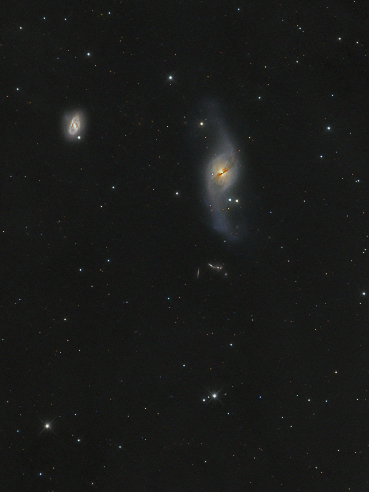 NGC 3718 is the galaxy in the upper-right corner of the image and lies at a distance of 52 million lightyears in the constellation of Ursa Major. Its distinctive shape is likely the result of gravitational interactions with the smaller spiral galaxy, NGC 3729, to the left. Below NGC 3718 is the Hickson Compact Group 56, which consists of five interacting galaxies. These galaxies aren’t smaller. Instead, they are about eight times further away than NGC 3718 and NGC 3729.