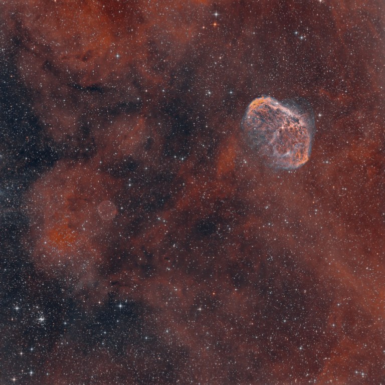 The second picture is a bi-color narrowband image in Ha and O3 of the hydrogen rich area in Cygnus. Top right is NGC6888 or Crescent nebula at a distance of 5000ly. Middle left is the very faint PN G75.5+1.7 or Soap Bubble nebula, discovered only very recently by an amateur astronomer in 2008 (not me, 🙂 )