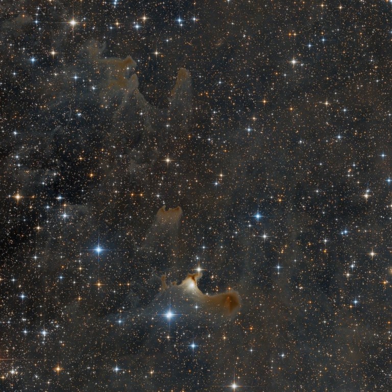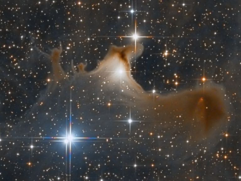 The Ghost Nebula (designated Sh2-136 and VdB 141) is a reflection nebula located in the constellation Cepheus. It lies near the cluster NGC 7023. Looking at the image, especially the cut-out, the nebula’s name is easily understood. The Ghost nebula is referred to as a globule and over 2 light-years across. There are several stars embedded, whose emissions make the nebula shine in brownish colour.