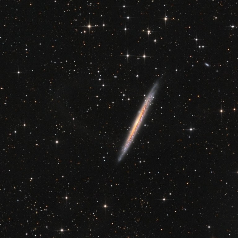 Spiral galaxies have an interesting property: They’re flat. When you see them face-on, you can clearly see their spiral structure. But if they happen to be oriented edge-on to us, they can look nearly as thin as a knife’s edge. NGC 5907 is a great example of that. Located roughly 40 million light years away in the constellation of Draco, it is very nearly sideways with respect to us, and so thin it was given the nickname “The Splinter Galaxy”. NGC 5907 also has a very faint and difficult to image tidal stream – a loop of stars that surround the galaxy. Astronomers theorize that NGC 5907 was formed about 8 billion years ago from the merger of dwarf galaxies. The tidal loop is a remnant of that long ago merger.