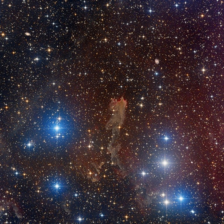 LBN 438 is a galactic dark nebula located in the south part of the constellation Lacerta. It is illuminated by interstellar radiation which is known as Extended Red Emission (ERE). Despite being part of the Lynds Bright Nebula catalog it is very faint. Distant galaxies many millions of light years in the distance can be seen in the top part of this picture.