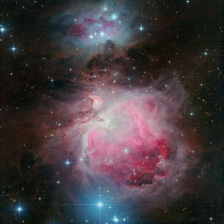 Messier 42 (M 42), the famous Orion Nebula, is an emission-reflection nebula located in the constellation Orion. With an apparent magnitude of 4.0, the Orion Nebula is one of the brightest nebulae in the sky and is visible to the naked eye. It lies at a distance of 1,344 light years from Earth and is the nearest stellar nursery. The Orion Nebula is a place of massive star formation and one of the most studied deep sky objects in our vicinity as it allows astronomers to study the process of stars forming from clouds of dust and gas and the photo-ionizing effects of massive young stars that are responsible for the nebula’s glow. The temperature in the central region is up to 10,000 K and considerably lower around the edges. Messier 42 contains hundreds of very young stars, less than a million years old, and also protostars are still embedded in dense gas cocoons. The nebula is home to about 700 stars in different stages of formation. The youngest and brightest members are believed to be less than 300,000 years old, and the brightest of these may be as young as 10,000 years old, real star babies!