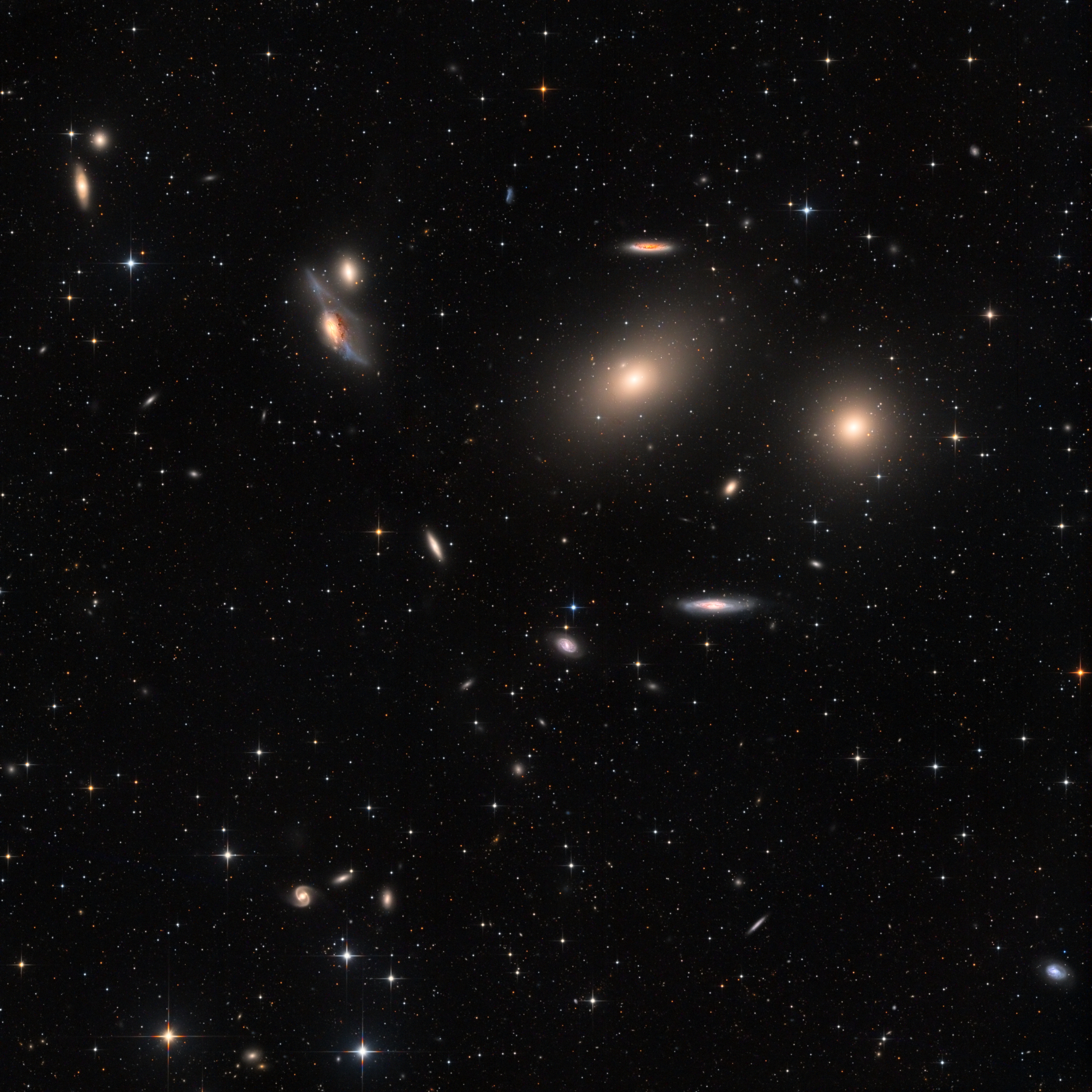 Markarian’s chain was named after an Armenian astronomer in the 1970s and represents a beautiful stretch of galaxies that forms part of the Virgo Cluster. Our own Local Group of galaxies (Milky Way, large and small Magellenic Clouds, M31, M32, M100, M33) is currently receding from the Virgo Cluster at a rate of about 1000 km/second. However, it is anticipated that our Local Group will eventually stop receding from the Virgo Cluster and will ultimately accelerate towards this region (gravity from the Virgo Cluster influences us even at distances of 70 million light years). M84 and M86 are the 2 large elliptical galaxies on the right (from right to left). M88 is the prominent spiral galaxy on the upper left. The most dominant galaxy in this region is M87, which is out of the field of view to the lower left. But is will soon be visible, as this picture is the first of a four panel mosaic.