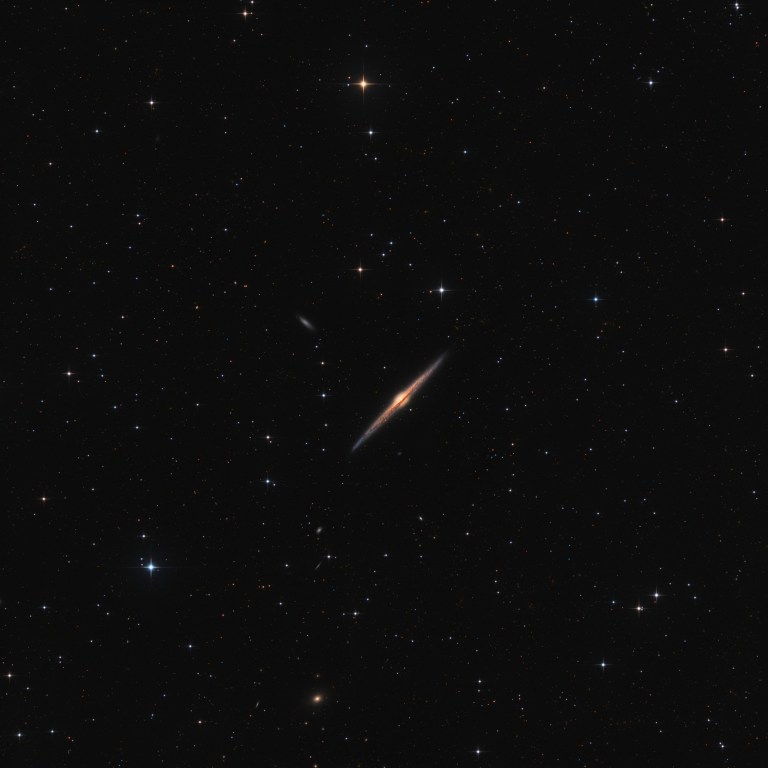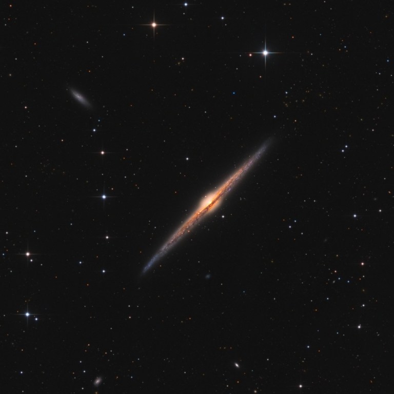 NGC 4565, also known as the Needle Galaxy, is an edge-on spiral galaxy approximately 40 million light years from Earth and is located in the constellation of Coma Berenices . This image reveals the galaxy’s bulging central core cut by obscuring dust lanes. An assortment of background galaxies is included in the field of view, with neighboring galaxy NGC 4562 at the upper left. Astronomers believe that our own Milky Way galaxy would appear this thin if viewed edge-on.