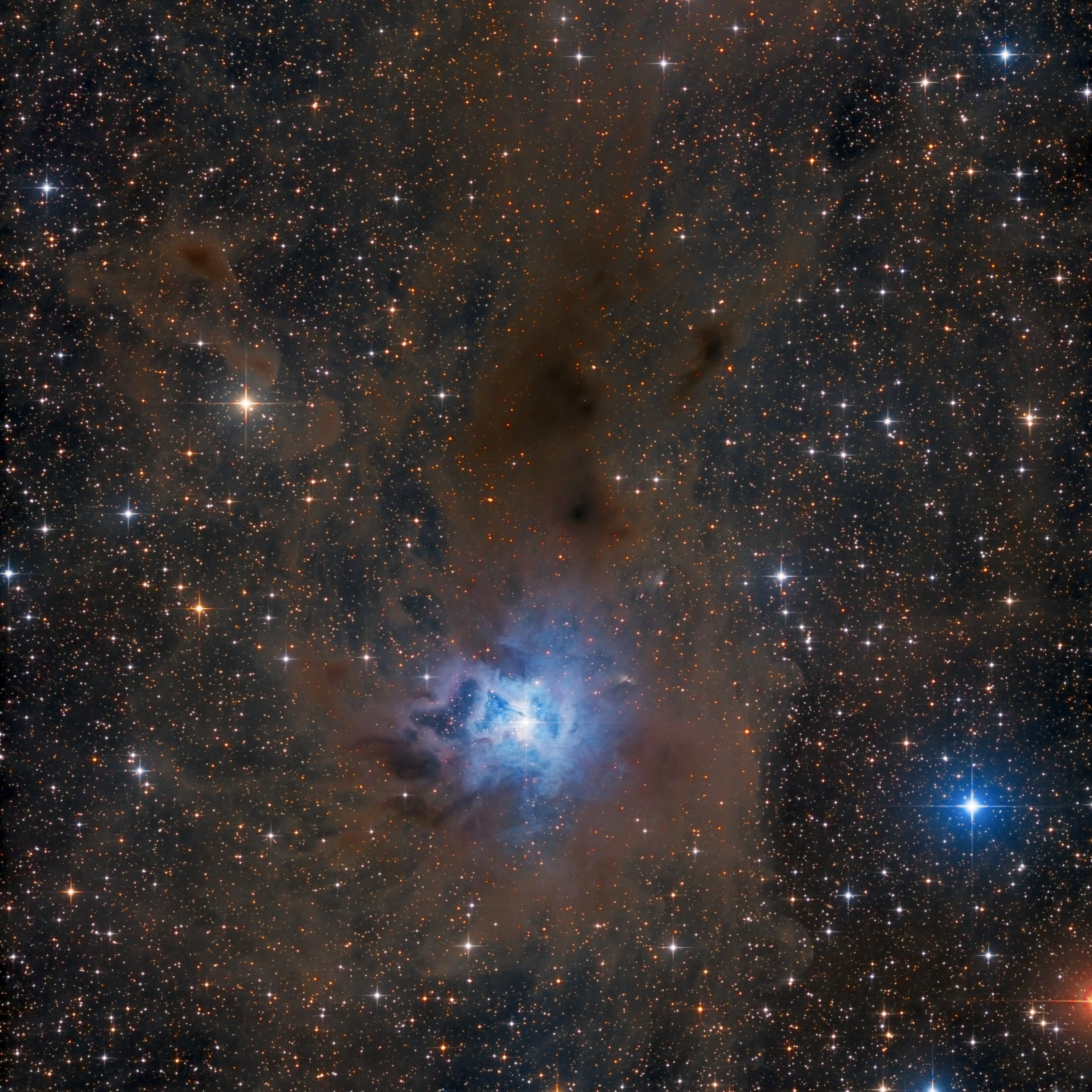 NGC 7023 is a reflection nebula located in the west central section of the far northern constellation of Cepheus. This nebula contains at its center an extremely young star named V380 Cep (mag. +7.1), which is believed to have burst into life just 5,500 years ago. Since incredibly young there is plenty of local dust surrounding the star, and when starlight hits the dust it’s reflected to become the visible nebula. There are faint hints of red color surrounding the central star. This is evidence of some hydrogen emission taking place. Its unusual structure gave rise to the name, the Iris Nebula. It lies 1,300 light-years away and is six light-years across.