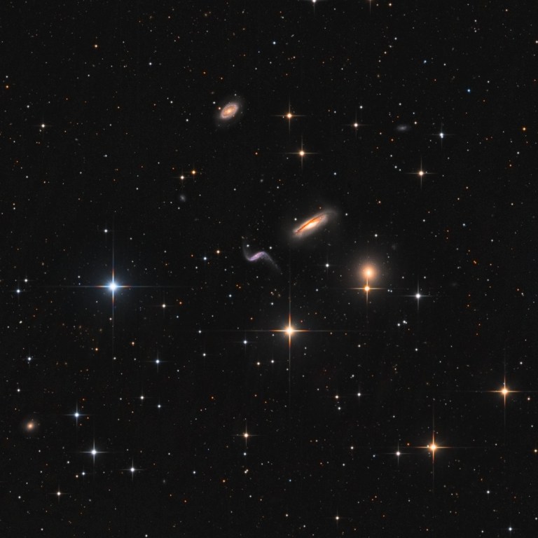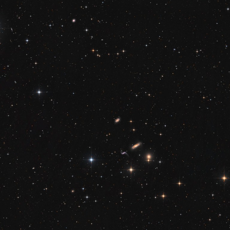 Hickson 44, a group of interacting galaxies in the constellation Leo, lies approximately 80 million light years from Earth. NGC 3190, the largest galaxy just right of center, is a spiral galaxy seen almost edge on. Its characteristic dust lane is its most prominent feature. To its lower left is NGC 3187, a barred spiral galaxy, and to the upper left is NGC 3185, another barred spiral with a smaller bar. To the right is NGC 3193, an elliptical galaxy. The galaxies in Hickson 44 are close enough that they interact with each other gravitationally. This causes the individual galaxies to become distorted and in some cases even share material. If you look closely, you may notice a faint halo around NGC 3190.