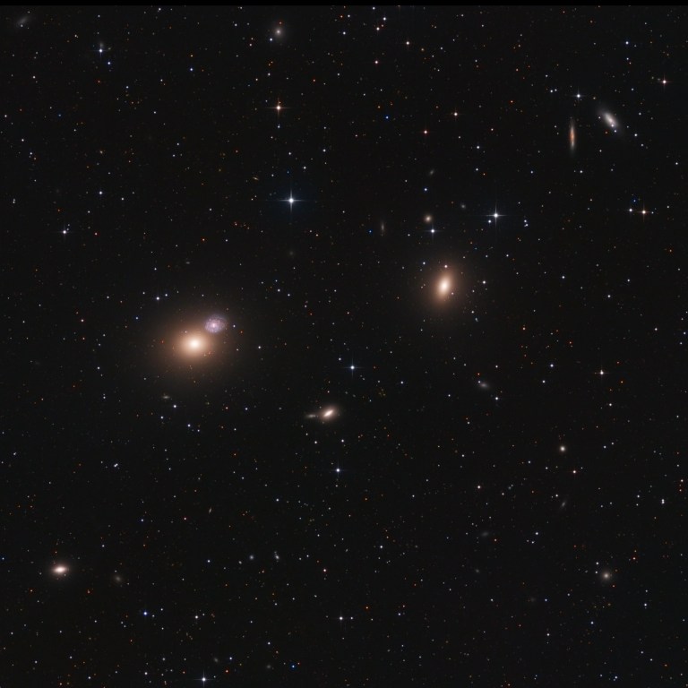 Messier 60 is a giant elliptical galaxy located in the constellation Virgo. M60 has an estimated mass of about a trillion solar masses and occupies an area roughly 120,000 light years in diameter. The galaxy’s halo is home to an estimated 5,100 globular clusters and some of these can be seen on this picture. Messier 60 forms a pair known as Arp 116 with the neighbouring spiral galaxy NGC4647. NGC4647 lies about 2.5 arc minutes from M60 and the galaxies’ optical disks overlap. However, the two galaxies are at different distances and may have only recently started interacting with each other. NGC4647 is about the same size as the Milky Way and about two thirds the size of M60. It is considerably less massive than its giant neighbour.