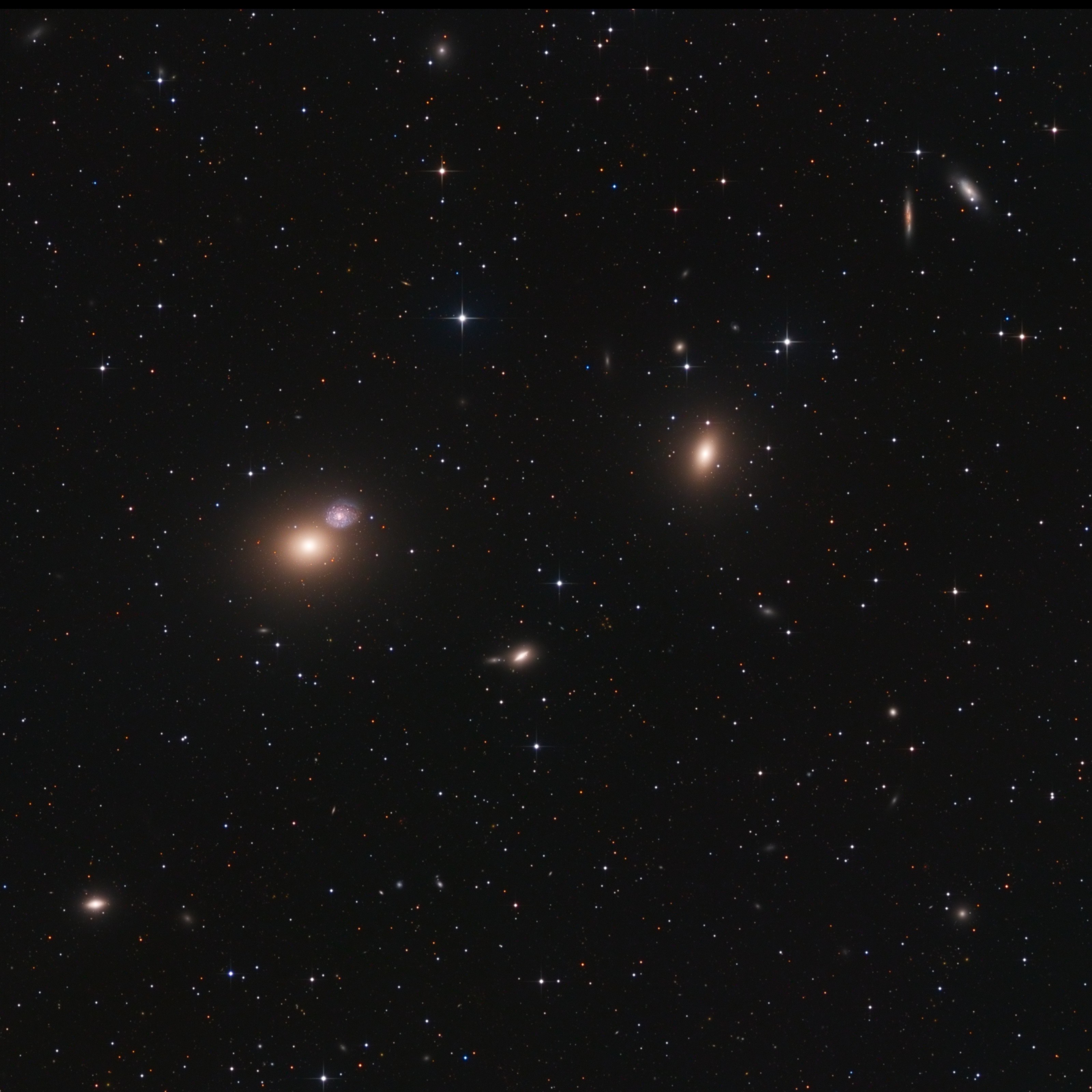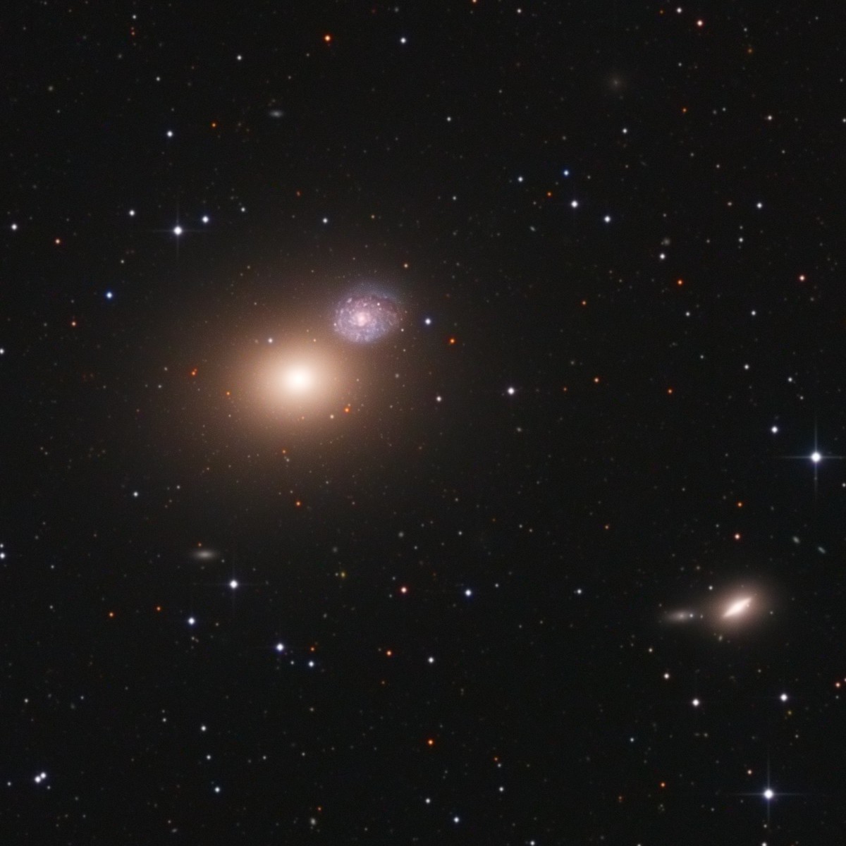 Messier 60 is a giant elliptical galaxy located in the constellation Virgo. M60 has an estimated mass of about a trillion solar masses and occupies an area roughly 120,000 light years in diameter. The galaxy’s halo is home to an estimated 5,100 globular clusters and some of these can be seen on this picture. Messier 60 forms a pair known as Arp 116 with the neighbouring spiral galaxy NGC4647. NGC4647 lies about 2.5 arc minutes from M60 and the galaxies’ optical disks overlap. However, the two galaxies are at different distances and may have only recently started interacting with each other. NGC4647 is about the same size as the Milky Way and about two thirds the size of M60. It is considerably less massive than its giant neighbour.