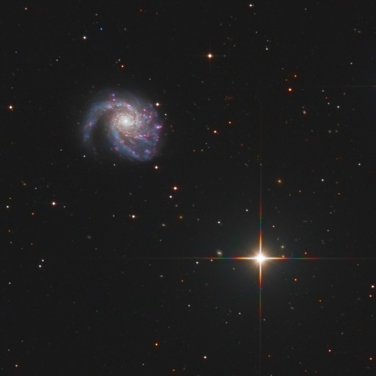 Messier 99 (M99), also known as the Coma Pinwheel or Virgo Cluster Pinwheel, is a galaxy in Coma Berenices. The galaxy is a member of the Virgo Cluster. It has an apparent magnitude of 10.4 and lies at a distance of 55.7 million light years from Earth. Messier 99 is a grand design spiral, completely unbarred and with two giant spiral arms. One of the spiral arms is normal and the other appears distorted. M99 is thus slightly asymmetric in shape, with the nucleus shifted from the galaxy’s centre, likely as a result of interactions with other galaxies in the Virgo Cluster, more specifically with the lenticular galaxy NGC 4262 about 280 million years ago. As a result of the encounter, the star forming rate in M99 is three times greater than in other galaxies of similar type.