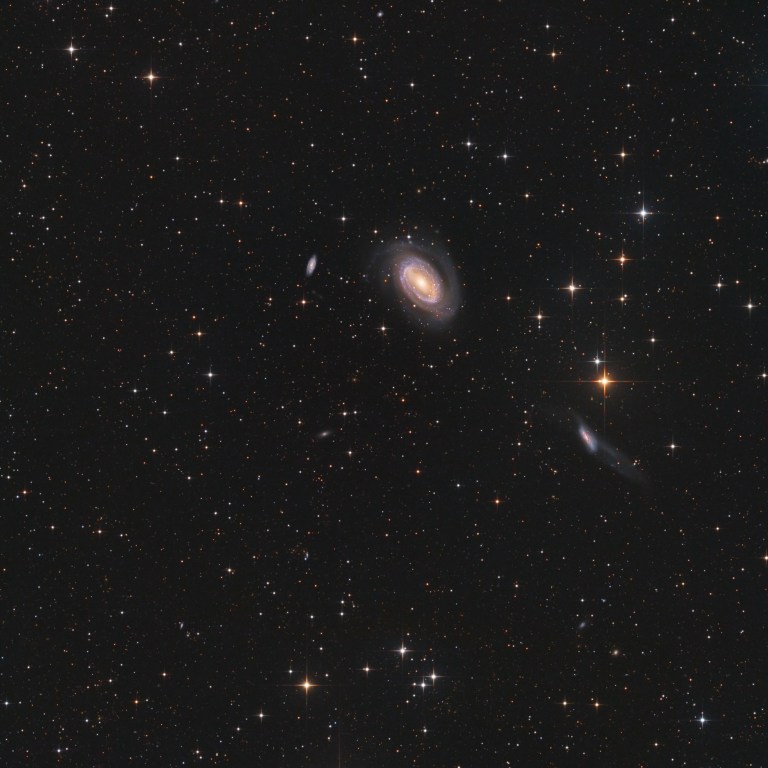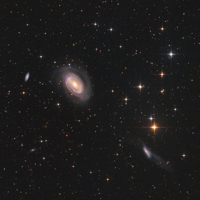 This beautiful trio of galaxies is in the area of the constellation Coma Berenices. NGC 4725 (center) and NGC 4747 (lower right) are neighbours at a distance of 45 to 57 million and 40 to 56 million light-years respectively. Galaxy NGC 4712, at the upper left, is in the background… about 207 million light-years away. Tidal interaction with supergiant spiral NGC 4725, is the generally accepted cause for the severe distortion of the smaller NGC 4747 galaxy. This interaction has given NGC 4747 three tidal tails, two large ones at the lower right and a smaller one at the opposite end of the galaxy. The direction of these three plumes trace directly towards NGC 4725. NGC 4725 has its own peculiarities. While most spiral galaxies have two or more arms, NGC 4725 seems to have only one. NGC 4725 is a Seyfert Galaxy, suggesting an active galactic nucleus containing a supermassive black hole.