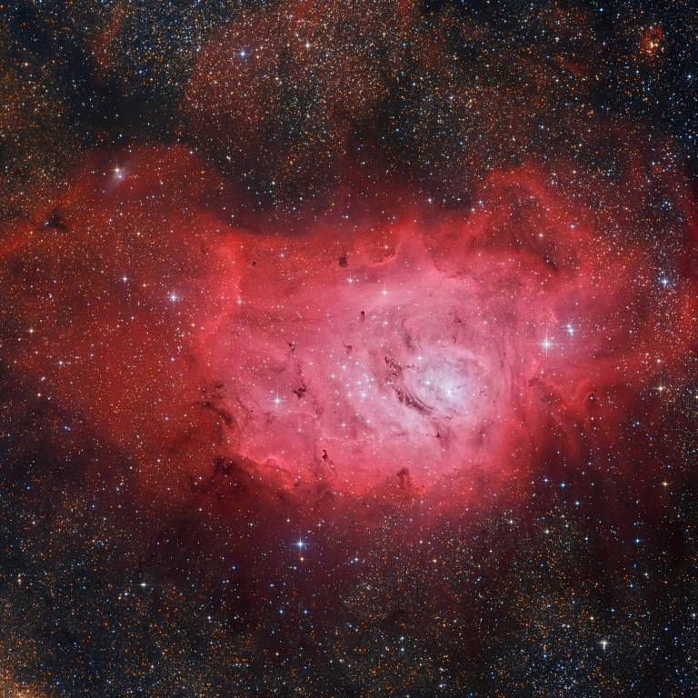 Messier 8, also known as the Lagoon Nebula, is a large, bright emission nebula located in the constellation Sagittarius. The star-forming nebula has an apparent magnitude of 6 and lies at a distance of 4,100 light years from Earth. The cluster is only about 2 million years old. The hot young stars in it are responsible for the nebula’s glow. Messier 8 never rises very high above the horizon for observers north of the equator, but can be seen in the summer months. From my observatory location the maximum altitude is barely crossing the 20° mark.