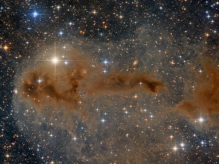 LDN1251 (Lynds’ Dark Nebula) is part of a molecular cloud structure in the constellation Cepheus. This is a region including several Herbig-Haro objects. These are visible as small red patches of nebulosity associated with newly born stars. Also on this image are distant galaxies, obscured by the molecular dust, the most prominent being PGC166755 (Left) and PGC69472 (Center). LDN1251 is about 1000ly away from Earth.