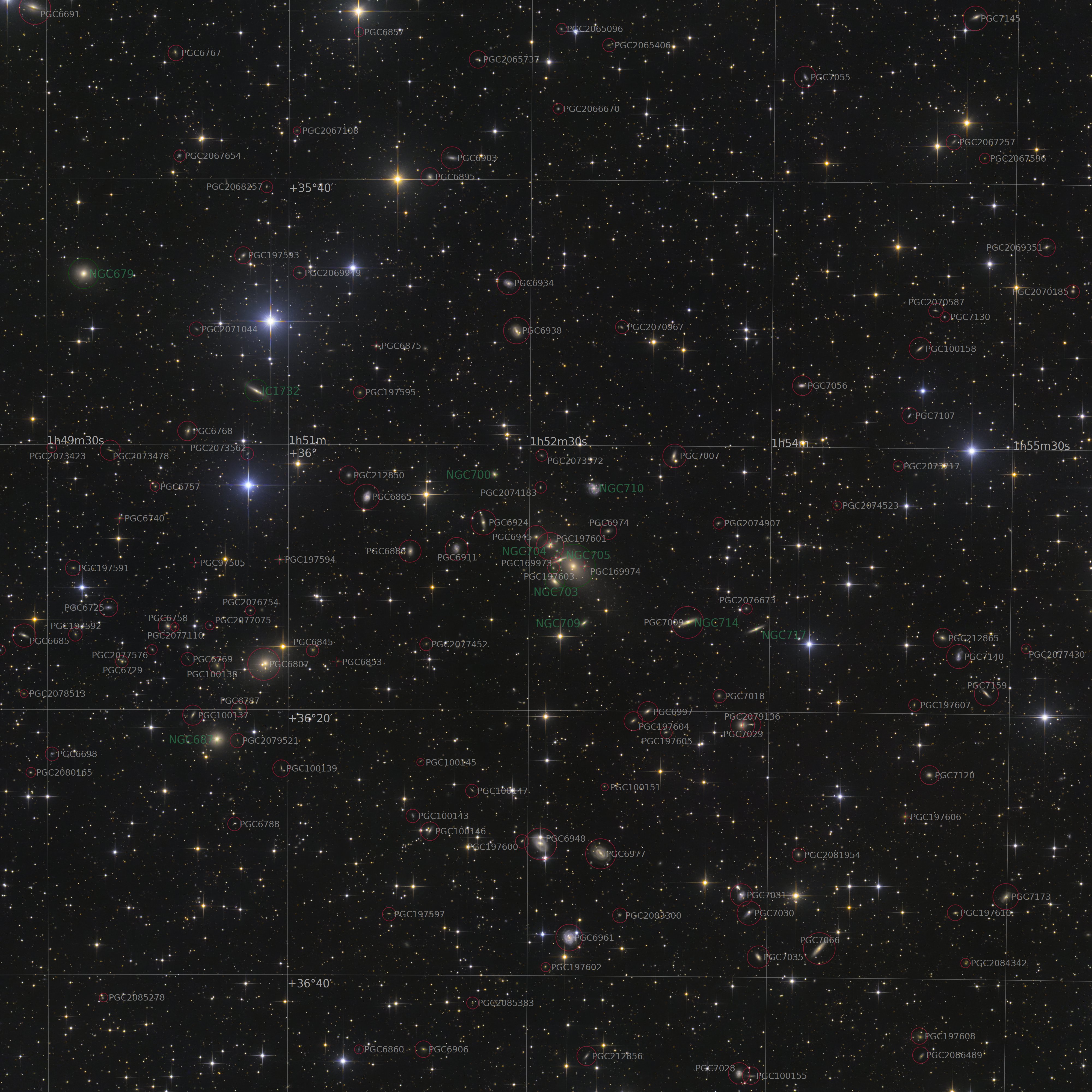 Abell 262 is part of the Perseus-Pisces chain of superclusters. This filament is one of the largest known structures in the universe and extends from the Perseus clusters (Abell 426) through to the NGC_507 and NGC 363 groups in northern Pisces. The group contains about 100 galaxies and is classified as an irregular cluster. Although its central galaxy, NGC 708, is a giant cD galaxy, most of its bright galaxies are spirals, which is unusual for a galaxy cluster.