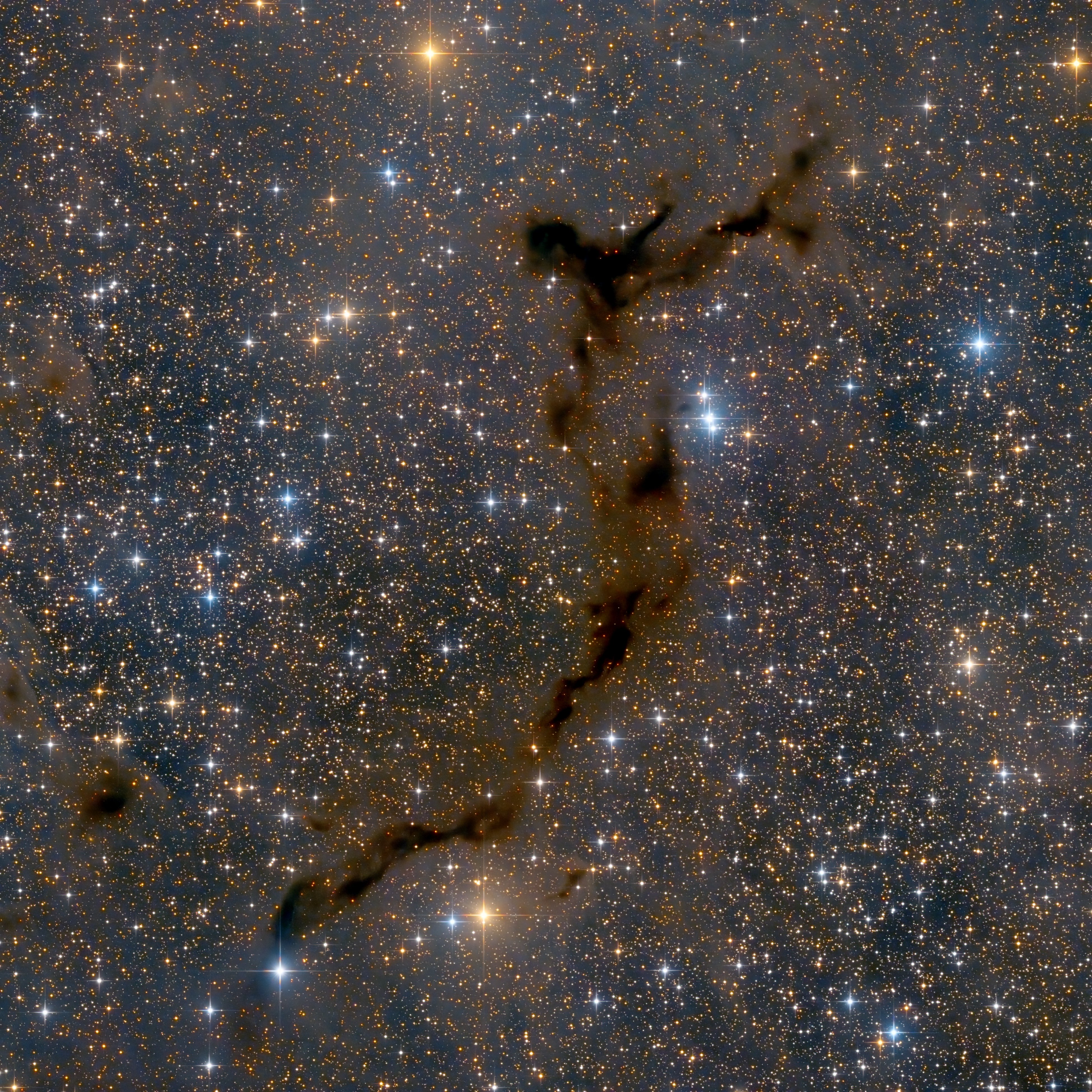 Barnard 150 is a dark nebula visible in the Cepheus constellation at a distance of 1,200 light-years. It is also known as the Seahorse Nebula due to its shape. This nebula is rich in interstellar cloud with a density in regions that is great enough to cause the obstruction of light emission from nearby stellar objects. The obstruction of light is seen as dark regions within the image.