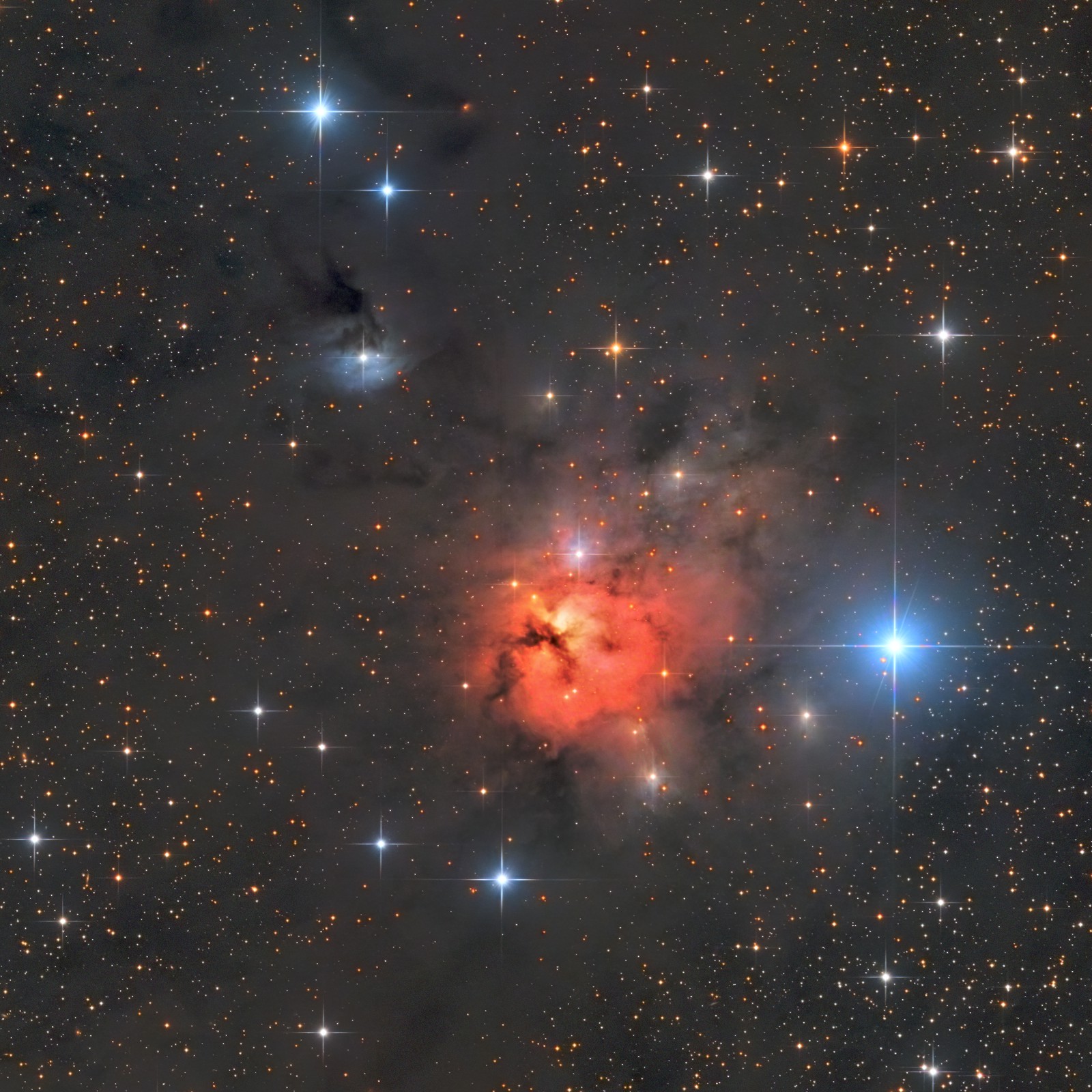 NGC 1579 is a dusty star forming region providing contrasting emission and reflection nebulae in the same field. It is some 3 light-years across, and located about 2100 light-years away in the northern constellation Perseus. It resembles the better known Trifid Nebula (Messier 20), located in the southern sky. That’s why this nebula is often called “the Northern Trifid”. This vast, dark cloud of dust and gas is one of the interstellar nurseries breeding new stars to light our Milky Way galaxy. NGC 1579 is lit it by an embedded, extremely young, massive star named LkHα 101, which is several times more massive the Sun and a strong emitter of the characteristic red hydrogen alpha light. This star lies within a small, young star cluster, together with dozens of sibling stars that are also newly formed. The central region of NGC 1579 is glowing red of hydrogen gas excited by the hot stars whereas the bluish regions are reflected starlight. Prominent dark dust lanes extend throughout the nebula. In fact, the obscuring dust is drastically dimming the visible light from the massive, young, hot stars still embedded in the cosmic cloud.