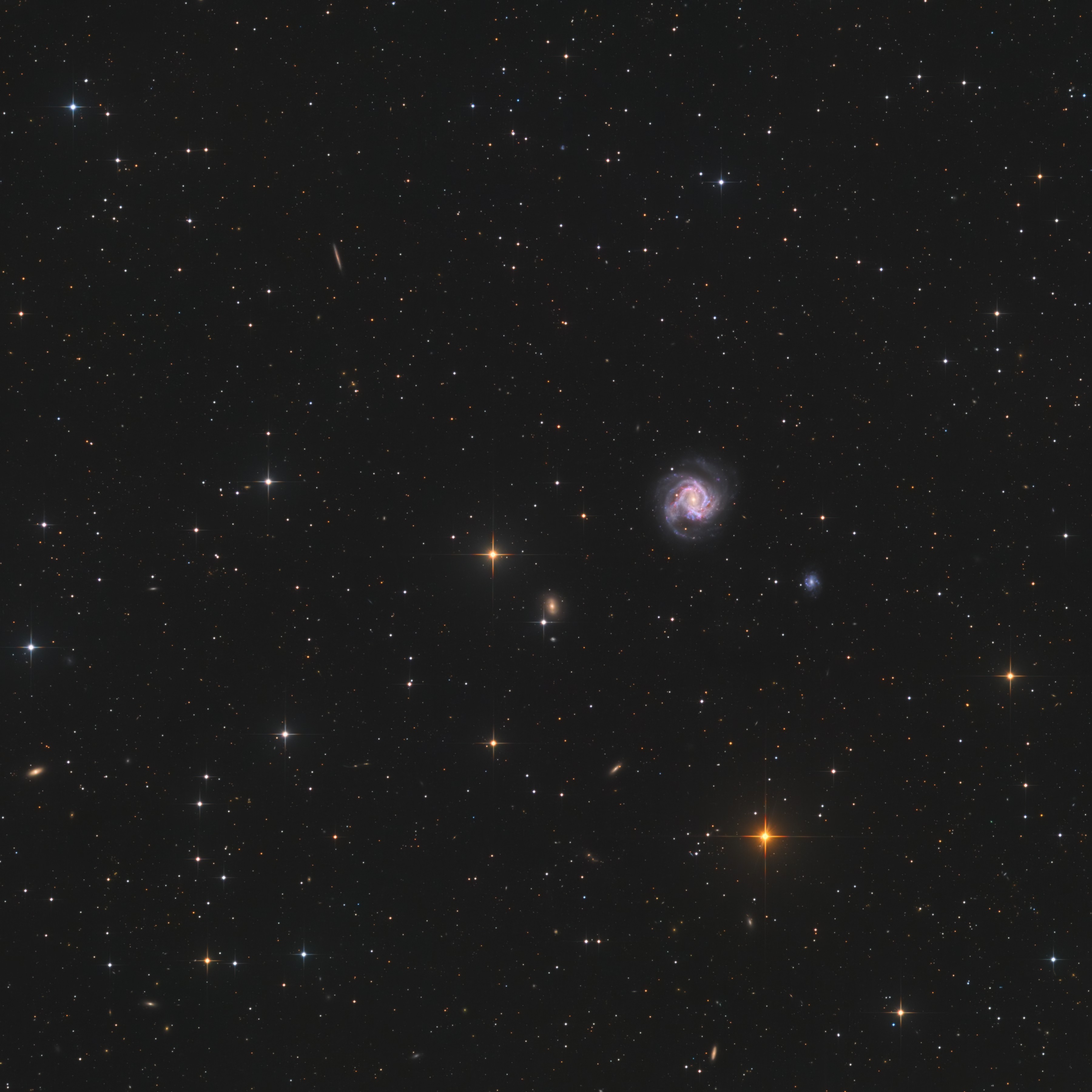 Messier 61 is a barred spiral galaxy located in the southern portion of the Virgo Cluster and lies at a distance of 52.5 million light years from Earth. It occupies an area of 6 arc minutes, corresponding to a spatial diameter of about 100,000 light years, roughly the same size as our galaxy. Messier 61 is classified as a starburst galaxy, one undergoing an extremely high rate of star forming activity. Eight supernovae have been detected in M61 in the last century, making M61 the current record holder among Messier galaxies.