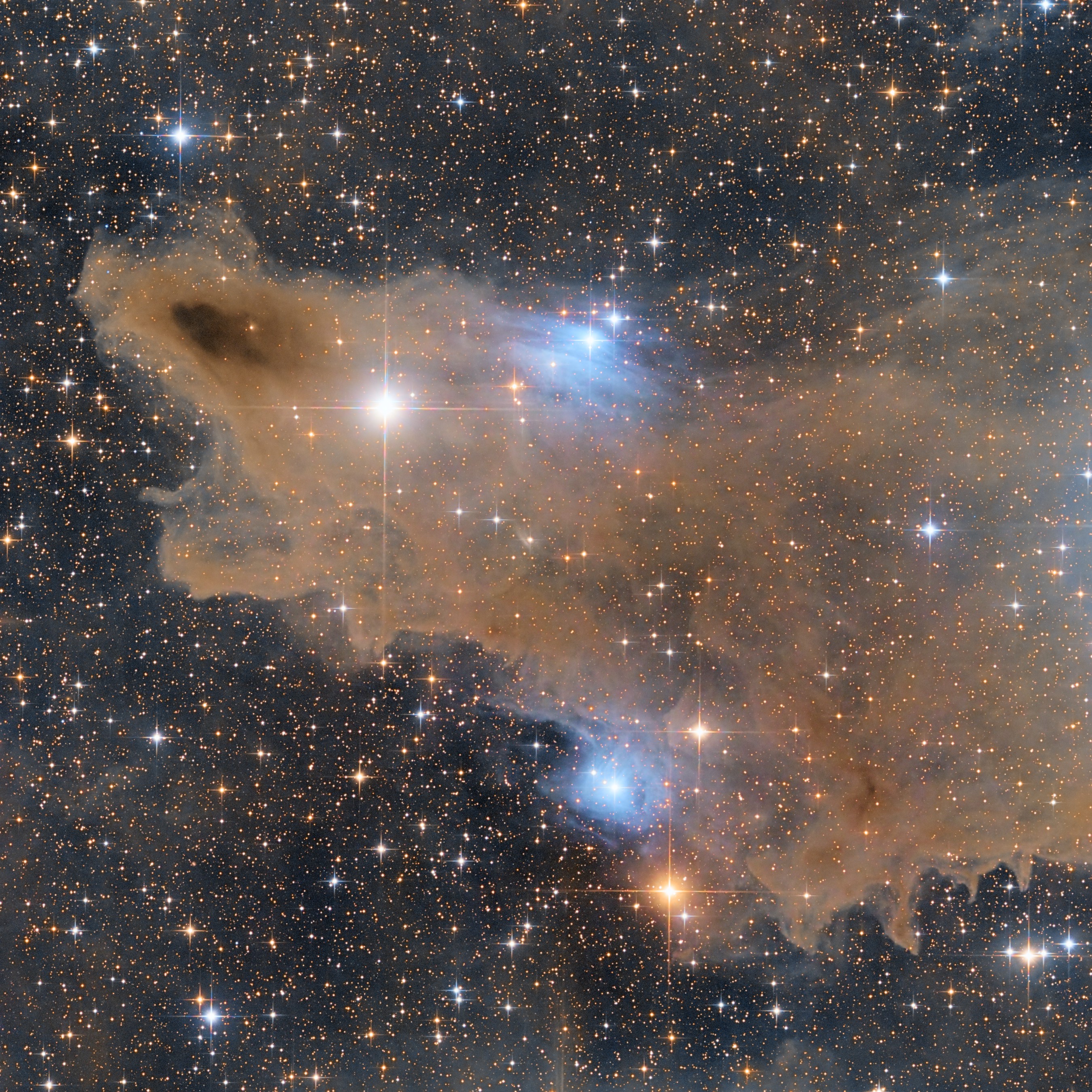 LDN 1235 is known as the Shark or Dark Wolf Nebula (whichever is your favorite!). The Shark nebula is a faint cloud of interstellar gas and dust in the constellation Cepheus. The image spans about halfof its actual length of about 15 light years. Within this dust cloud are several other objects. The darker dusty area to the top left is LDN 1235, the densest part of this dust cloud. The bright blue reflection nebula on the top of the image is VdB 150 and the bottom blue reflection nebula is VdB 149. Both these beautiful reflection nebula shine with the color of very hot B8IV stars within these parts of the nebula. This dusty cloud is approximately 650 light years distant. This is a reprocessed image with data from 2017 (as my processing techniques have evolved).