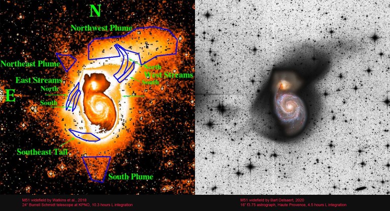 This image is a new rendition of Messier 51 with new RGB data and combined with luminance and Ha data from 2018. M51, also known as the Whirlpool Galaxy, is a grand design spiral galaxy located in the constellation of Canes Venatici. It’s one of the most famous galaxies in the sky, appearing face-on when viewed from Earth. At magnitude +8.4, it’s relatively bright and visible in binoculars, especially from dark sites. M51 has a much smaller dwarf companion, known as NGC5195, and together they form the finest and most studied example of an interacting galaxy pair in the sky. Though M51 looks faint and fuzzy to the eye, deep images like this one can reveal the faint tidal debris around the smaller galaxy.