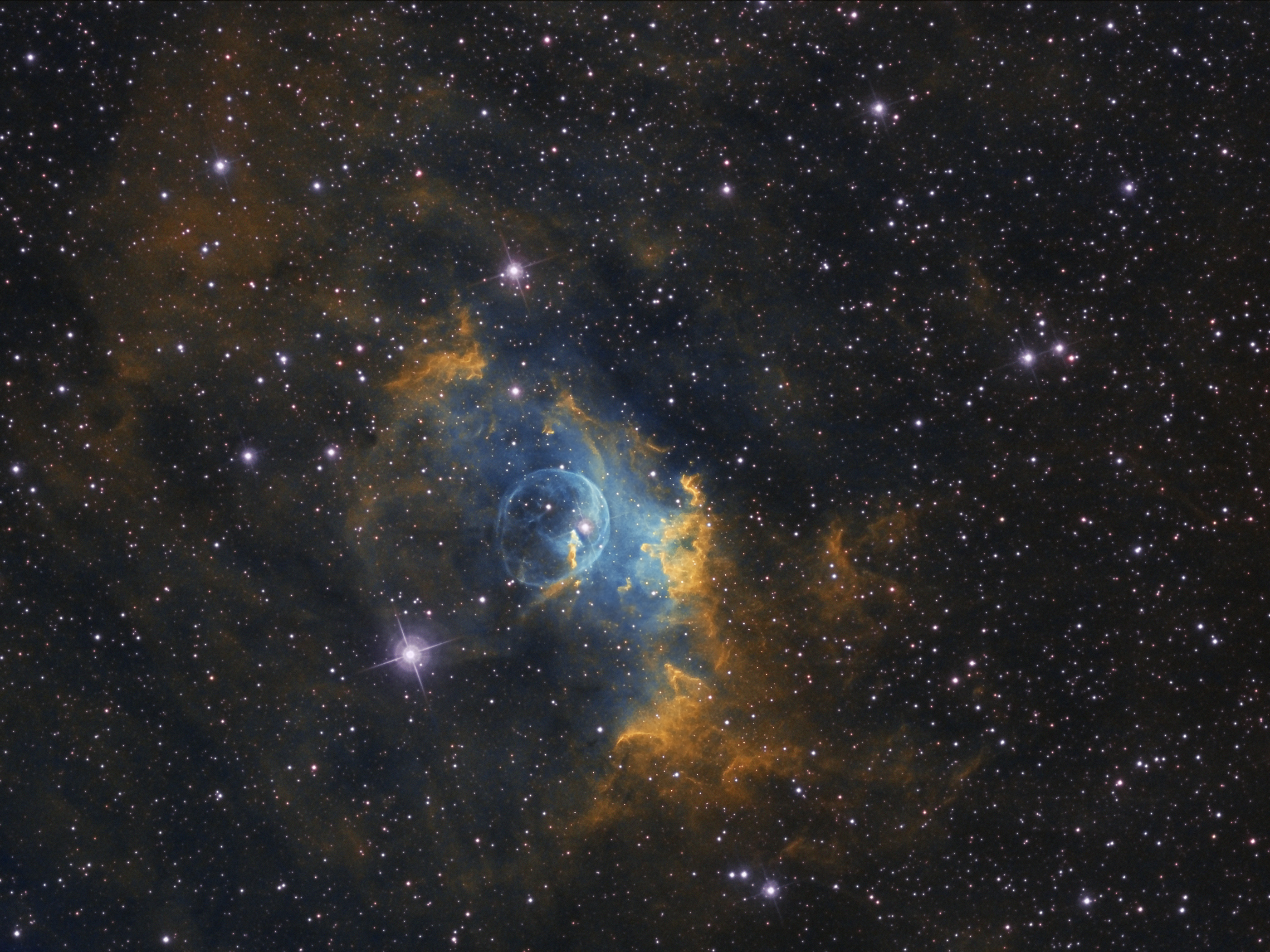 Mapping Hα, O-III and S-II to red, green and blue is problematic when two of them are red, one is green and none is blue. Astronomers deal with this by using false colour — one or more of these elements is going to have to take a hit for the team and take on an unnatural hue. The Hubble palette assigns red to S-II, green to Hα, and blue to O-III: red is accurate, green and blue are false.